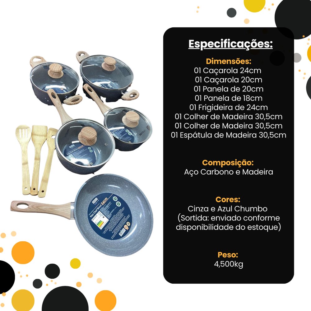 Dimensões: 01 Caçarola 24cm / 01 Caçarola 20cm / 01 Panela de 20cm / 01 Panela de 18cm / 01 Frigideira de 24cm / 01 Colher de Madeira 30,5cm / 01 Colher de Madeira 30,5cm / 01 Espátula de Madeira 30,5cm