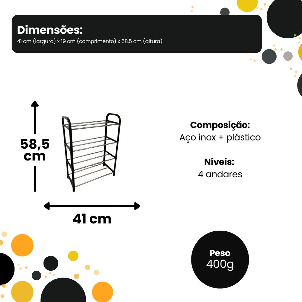 Essa sapateira 4 andares em inox foi desenvolvida para quem busca mais organização, aproveitamento de espaço e um visual mais limpo para a casa. Compacta por fora e espaçosa por dentro, ela permite armazenar diversos pares de calçados de forma prática, mantendo tudo bem visível e fácil de acessar no dia a dia. Sua estrutura conta com tubos de metal em inox, que garantem maior resistência, durabilidade e estabilidade, mesmo com uso constante. As laterais em plástico reforçado oferecem sustentação firme para as prateleiras, evitando deformações e aumentando a vida útil do produto. Além disso, o design aberto facilita a ventilação dos calçados, contribuindo para evitar odores e manter os pares em melhores condições por mais tempo. Ideal para quartos, closets, lavanderias e halls de entrada, é uma solução funcional, leve, fácil de montar e que ajuda a manter o ambiente sempre organizado.