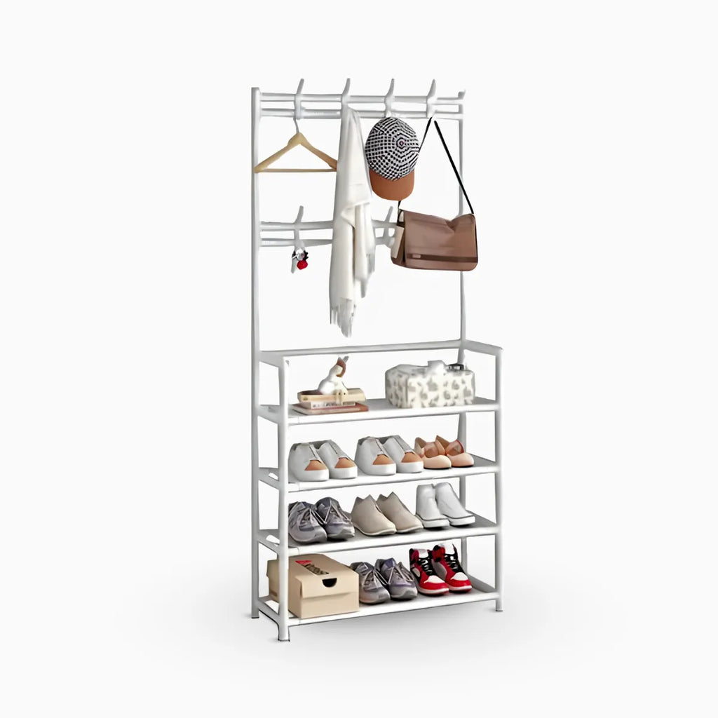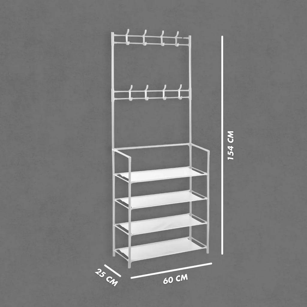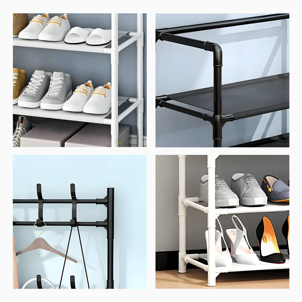 - Estrutura Robusta e Durável: Fabricada em ferro de alta qualidade, a estrutura metálica oferece grande resistência e durabilidade, suportando o peso dos objetos armazenados. O design combina o cabideiro para roupas e o suporte para sapatos de forma funcional e eficiente.