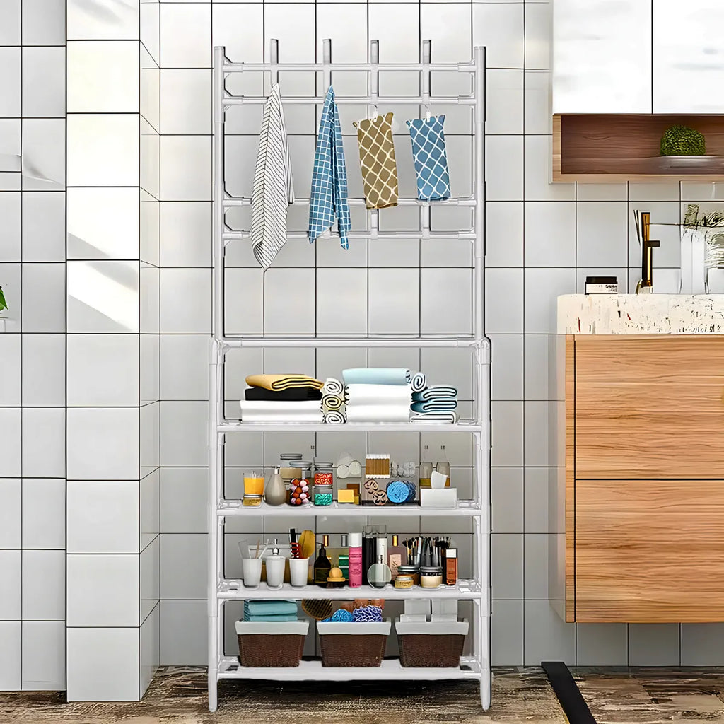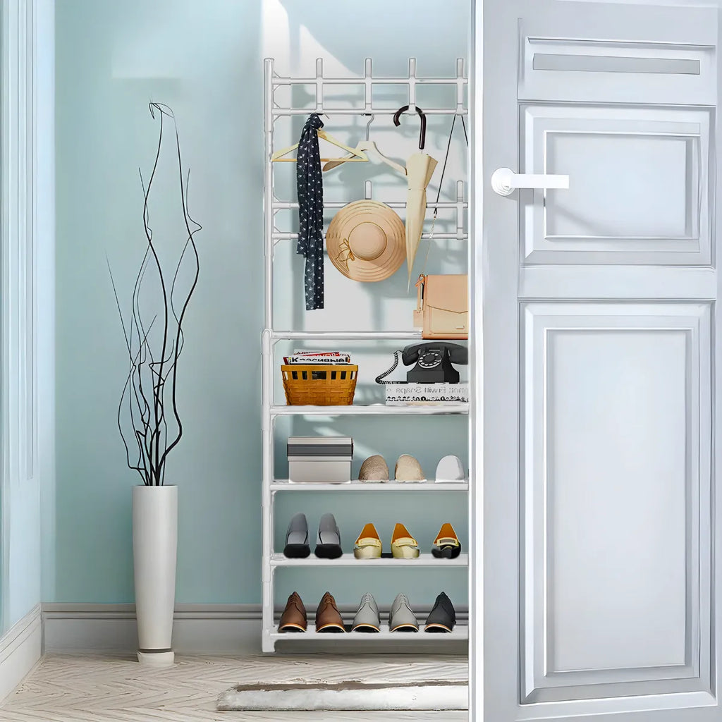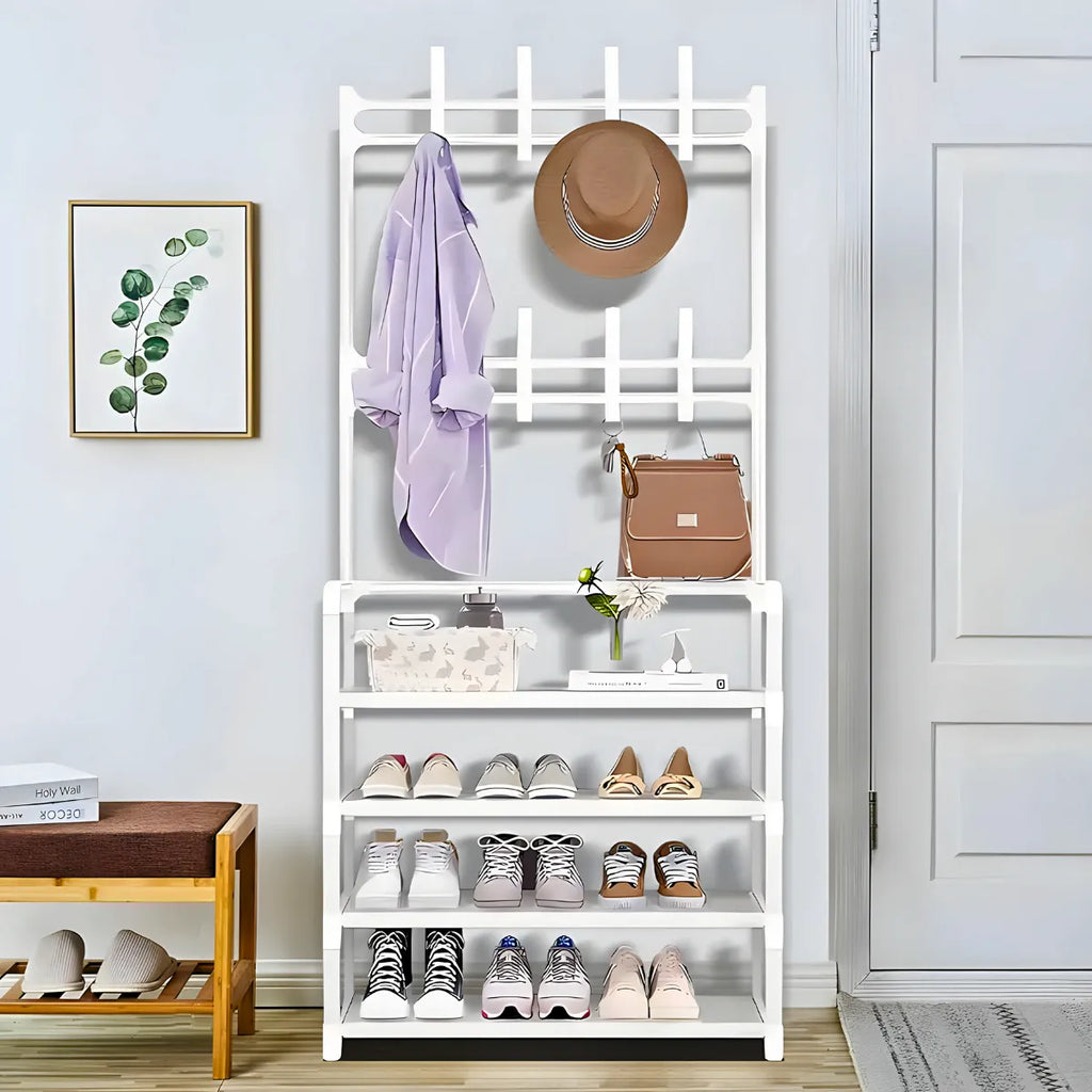 - Estrutura Robusta e Durável: Fabricada em ferro de alta qualidade, a estrutura metálica oferece grande resistência e durabilidade, suportando o peso dos objetos armazenados. O design combina o cabideiro para roupas e o suporte para sapatos de forma funcional e eficiente.