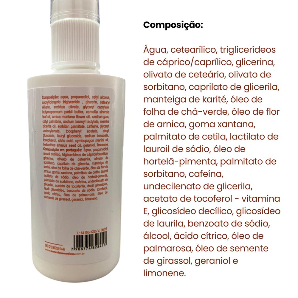 Composição (principais ativos): Água, Propanediol, Glicerina, Triglicerídeos de caprílico/cáprico, Manteiga de karité, Cafeína, Óleo de chá-verde, Extrato de arnica, Óleo de hortelã-pimenta, Óleo de palmarosa, Óleo de girassol, Vitamina E