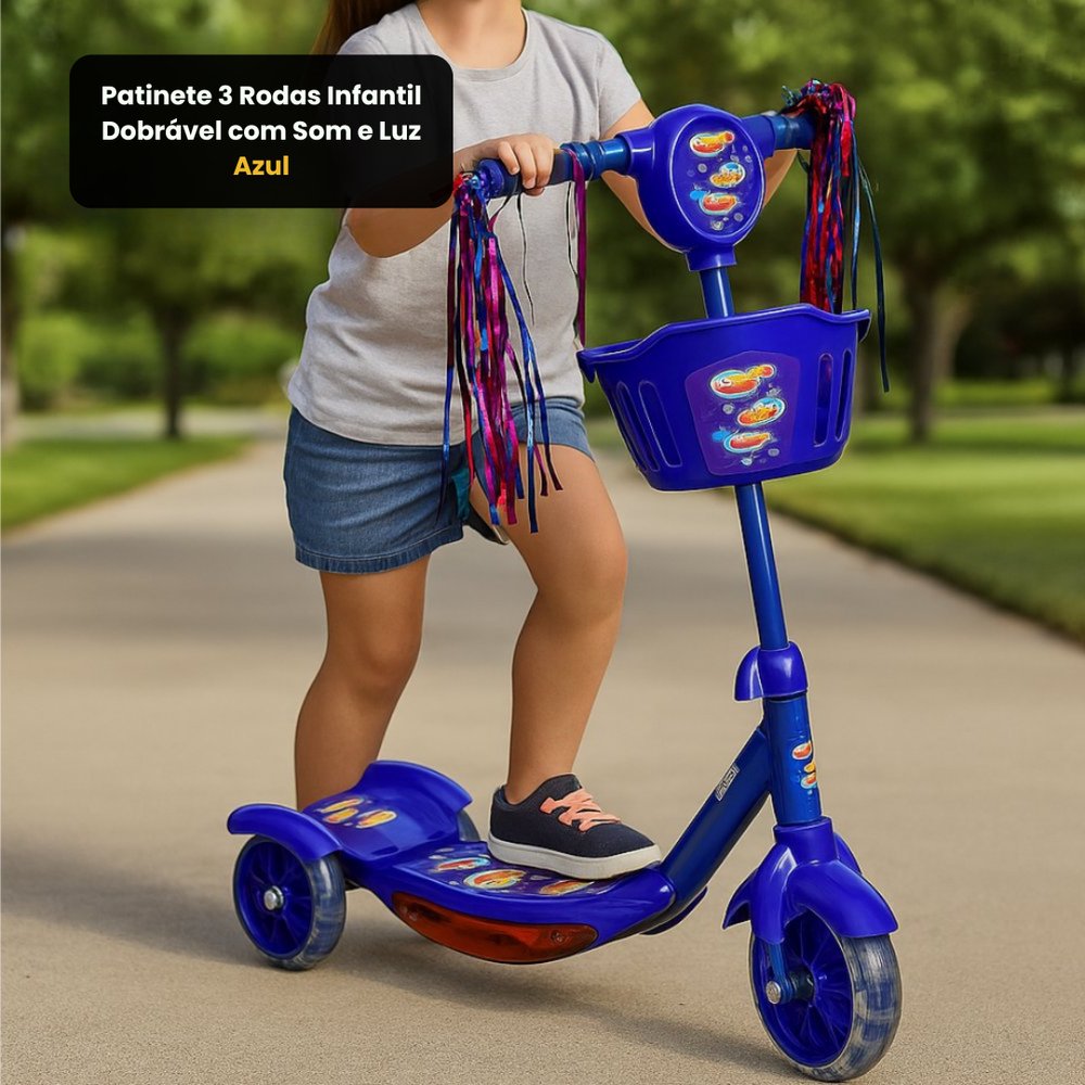 Patinete 3 Rodas Infantil Dobrável com Som e Luz - Azul
