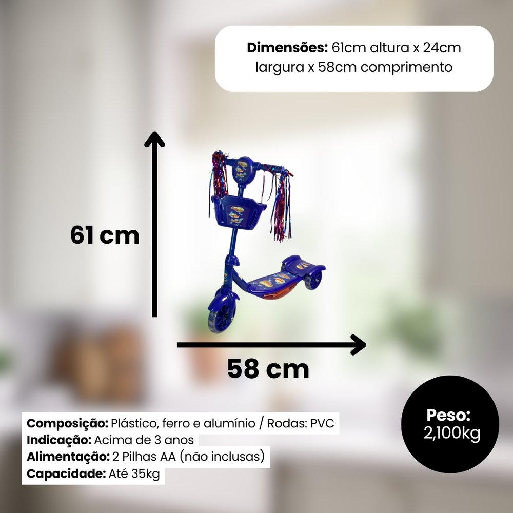Perfeita para transformar qualquer momento em uma aventura cheia de diversão, música e brilho! Desenvolvido especialmente para crianças, ele oferece segurança, conforto e um design encantador que estimula o movimento e o equilíbrio de forma lúdica e segura. Suas rodas brilham enquanto giram, criando um efeito visual incrível durante o passeio, e o apoio com luz e som torna a brincadeira ainda mais animada, com músicas divertidas que encantam os pequenos. Equipado com cestinha frontal para levar brinquedos e acessórios favoritos, o patinete ainda possui enfeites coloridos nas laterais do guidão, proporcionando um visual alegre e cheio de personalidade. O sistema de freio traseiro acionado pelo pé garante total segurança, permitindo que a criança controle facilmente a velocidade. Fabricado com materiais de alta resistência e acabamento de qualidade, suporta o uso diário e é ideal para atividades ao ar livre, promovendo o desenvolvimento da coordenação motora, equilíbrio e independência. Leve, portátil e fácil de montar, combinação perfeita entre diversão, estilo e aprendizado, tornando-se o presente ideal para crianças que adoram se movimentar e explorar o mundo com alegria e imaginação. Indicado para crianças acima de 3 anos